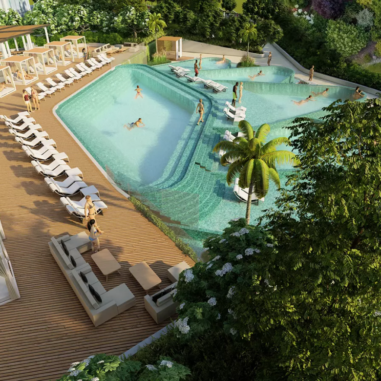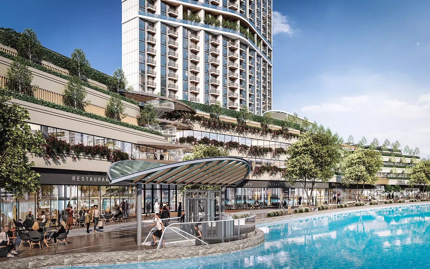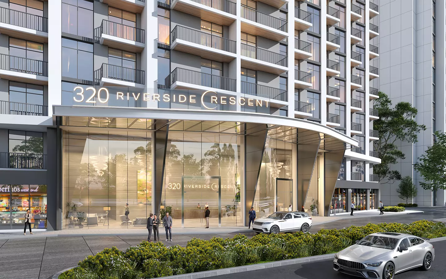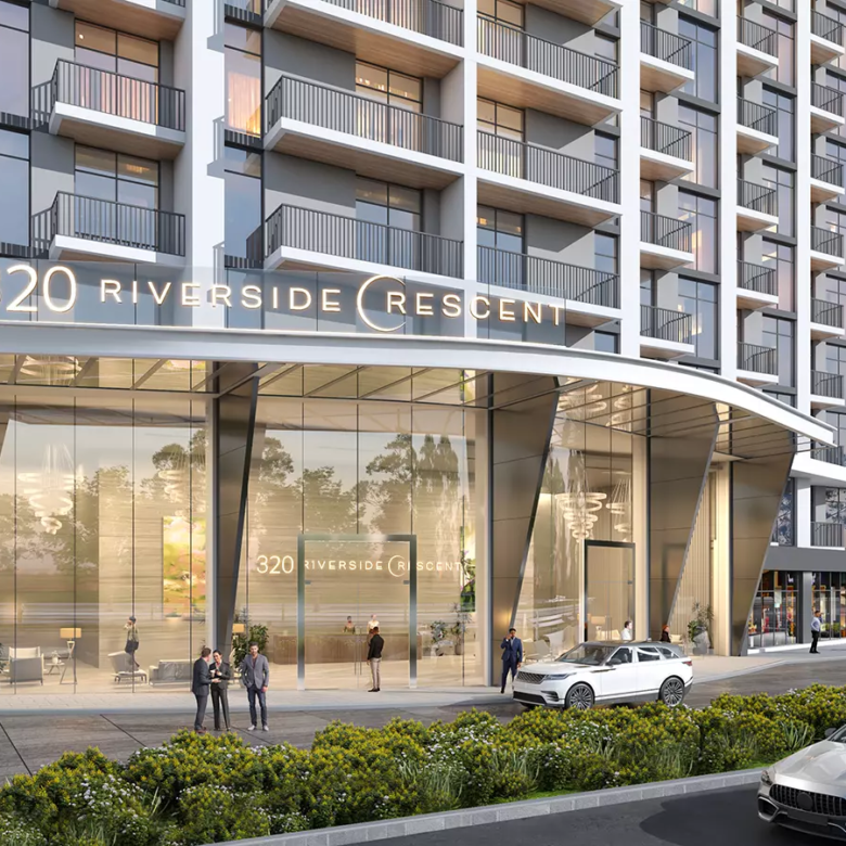 The inaugural tower, 330 Riverside Crescent, boasts an advantageous location adjacent to a sprawling 100,000 sqft public plaza. This strategic placement offers residents an array of conveniences and services right at their doorstep.